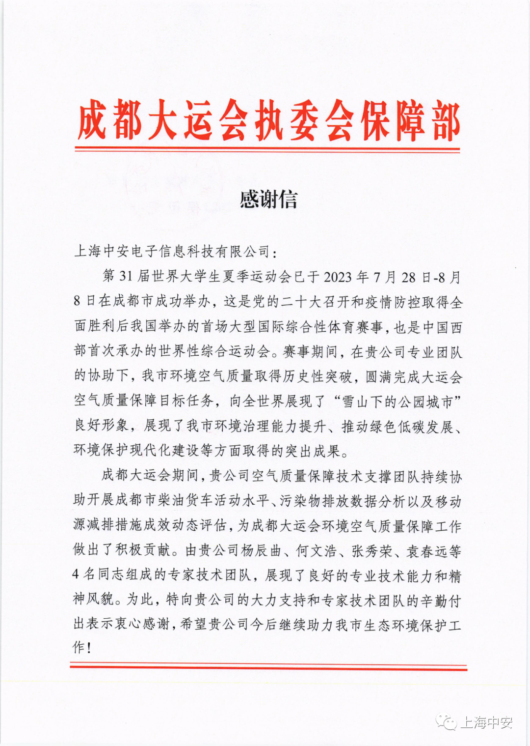 中安科技圓滿完成第31屆世界大學(xué)生夏季運(yùn)動(dòng)會(huì)空氣質(zhì)量保障任務(wù)!(2023-10-9)